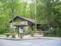 The park was the site of a ski resort from the 1960s until 1982. The state legislature authorized "construction of ski facilities" at the park in 1961,[32] which were operational by 1965.[33] Although managed by the state, a commercial operator was sought as early as 1969,[34] and in 1980 it was leased to a private contractor, before being closed in 1982.[23][35] The ski area was primitive by modern standards: skiers were lifted to the top of the slope by one of two tow ropes or Poma lifts,[34] and the slopes had about 250 feet (76 m) of vertical drop.[36] As of 2020, the ski lodge, renamed Cabin 20, can be rented out by park visitors,[37] while the Ski Slope Trail is a 2-mile (3.2 km) hiking trail that passes near the former ski slope. It begins at the beach parking lot, climbs Rattlesnake Mountain, and crosses Pennsylvania Route 504 near a historical marker for the Philadelphia–Erie Turnpike.[12]