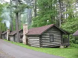 Cabins 1 - 6 are single room log cabins with saddle corners and white cement chinking. They have gable entries and an exterior stone fireplace on the end opposite the entry. Cabins 7 - 12 are two-room log cabins with eave entries and stone fireplaces along the rear walls. The Lodge (also known as Cabin 13) is a large rectangular clapboard-sided building with a large centrally located stone fireplace. Cabin 14 is an L-shaped cabin with an open porch; the stone fireplace forms one exterior wall, while the other walls are clapboard.[3] Two pit latrines built by the CCC are protected: both have shed roofs and are clapboard sided.[3]