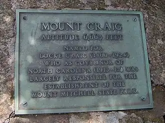 Mount Craig | 6,647 ft/2,026 m | South-central Blacks | 35.777584, −82.261759 | Locke Craig (1860–1925), North Carolina governor |