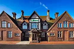 The tall, two-storey, north, reception-hosting wing has a grand chimneyed, Tudorbethan main façade. It has two mock-beamed wall dormers to recesses flanking a main link dormer; it has octagonal-theme, gabled, geometric style with octagonal porch and the princely arms above.[3] It was a spacious, modern public house/entertainment facility, built by Charringtons in the 1930s as a modest roadhouse. The site is named after Edward, the Black Prince who married Joan of Kent, seized of Chislehurst and other manors. He was a celebrated battle leader in France in the first phase of the Hundred Years' War (1337–1360). Reputedly his ghost haunts the later building or grounds of Hall Place.[4][5] Edward Heath stayed at the hotel as part of his campaign to become MP for Bexley in the 1950 general election.[6] The later south wing, of three storeys, linked, enlarges the hotel.