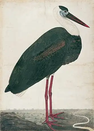 The painting depicts a Woolly-necked stork (Ciconia episcopus), a large wading bird that includes the Indian subcontinent in its range.[1] Done in watercolor on European paper, the work was produced by an unknown Indian artist, in what is known as the Company style. The work is traceable to a series of 658 paintings of birds that the French-born Major-General Claude Martin commissioned for his private collection.[2][3]