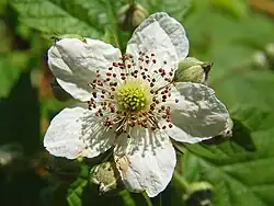 The flowers bloom in late spring and early summer on the tips of branches.[7][8] Each flower is about 2–3 centimetres (341+14 inches) in diameter, with five white-pink petals.[7][8] The fruit only develops around ovules fertilized by the male gamete from a pollen grain. The most likely cause of undeveloped ovules is inadequate pollinator visits.[11] Infection with raspberry bushy dwarf virus sometimes causes no visible symptoms and sometimes causes incomplete drupelet development and crumbly fruit.[12]