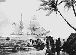 The violence and death surrounding the Queensland blackbirding trade intensified in the early 1880s. Local communities in the New Hebrides and the Solomon Islands had increased access to modern firearms which made their resistance to the blackbirders more robust. Well known vessels that experienced mortality amongst their crews while attempting to recruit Islanders included Esperanza at Simbo, Pearl at Rendova Island, May Queen at Ambae Island, Stormbird at Tanna, Janet Stewart at Malaita and Isabella at Espiritu Santo amongst others.[70][71] Officers of Royal Navy warships attempting punitive action were not exempt as targets with Lieutenant Bower and five crew of HMS Sandfly being killed in the Nggela Islands[72] and Lieutenant Luckcraft of HMS Cormorant being shot dead at Espiritu Santo.[73] Numerous punitive expeditions were carried out by Royal Navy warships based at the Australia Station. HMS Emerald under Captain William Maxwell went on an extensive punitive expedition, shelling and destroying about 33 villages,[74][75] while marines of HMS Cormorant executed various Islanders suspected of killing white men.[76] Captain Dawson of HMS Miranda led a mission to Ambae Island, killing a chief suspected of murdering blackbirders,[77] while HMS Diamond went on a "savage-hunting expedition" throughout the Solomon Islands which resulted in no casualties on either side.[78] At Ambrym, the marines of HMS Dart under Commander Moore, raided and burned down a village in retaliation for the killing of Captain Belbin of the blackbirding ship Borough Belle.[79] Likewise, HMS Undine patrolled the islands, protecting the crews of blackbirding vessels such as Ceara from mutinies of the labour recruits.[80]