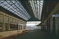 The station was covered by twin train sheds, an architecturally detailed canopy that covered all platforms. In 2000, due to its decaying state, it was removed, changing the nature of the station in a £35 million regeneration project. A new building was built on the main island platform. The Grade II listed original entrance built in the 1880s,[4] including the station buffet and former booking hall, was retained and refurbished.