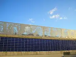 A piece of public artwork by artist Stephen Charnock was also erected at the edge of the platform, which consists of a stainless steel screen depicting Blackburn's industrial past and its more modern life today.[5] The images include some of Blackburn's most successful figures and famous visitors such as David Lloyd George (Liberal politician), Mahatma Gandhi (campaigner for Indian independence), Kathleen Ferrier (singer), Barbara Castle (Labour politician), Carl Fogarty (superbike racer), Wayne Hemingway (fashion designer) and Jack Walker (businessman). Platform 4, which had previously not been in timetabled use since the 1970s, was reopened for regular services as part of the work.