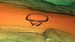 The camp has a single 5 metres (16 ft) wide entrance on the south side.[4] Originally, the entrance had a gateway with wooden gates, possibly within a wooden gate-tower.[4] The entrance was gravelled using pebbles from a nearby stream suggesting heavy usage was expected in the wetter seasons.[4] The three other entrances are believed to have been built more recently than the Iron Age.[6] In front of the entrance is a triangular earthwork, or barbican, flanked by a bank and ditch.[4] It is not known whether this earthwork was a defensive structure or had a practical use such as holding cattle.[4]