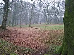 Blackbury Camp sits on an east to west ridge overlooking valleys formed by tributaries of the River Coly,[1] some 185 metres (607 ft) above sea level.[3] The camp consists of an oval enclosure, around 200 metres (660 ft) long and 100 metres (330 ft) wide, which is surrounded by a rampart 3 metres (9.8 ft) high and up to 10 metres (33 ft) wide.[4] The rampart was built from clay and flint quarried from a surrounding outer ditch which is up to 12 metres (39 ft) wide.[4] Today the ditch contains up to 2 metres (6.6 ft) of silt, so the earthworks would have looked more imposing with a deeper ditch when they were built.[5]
