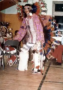 Solo singing may have been more prominent, or the norm, in the past, but group singing has increased in prominence, with singing/drumming groups called "drums". Vocal blending is not required in ensemble singing. The leader may begin the head motive or phrase of a song, and then be repeated or "raised" by another singer, possibly the second singer.[7] In pan-Indigenous powwow terminology, stanzas to a song are often called "push-ups".[8]