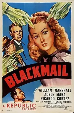 Blackmail is a 1947 American film noir crime film directed by Lesley Selander and starring William Marshall, Adele Mara and Ricardo Cortez.[1] The lead character is based on a pulp magazine hero Dan Turner, Hollywood Detective.