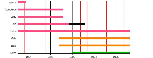 On July 31, 2023, leader Fatou "confirmed on the Veeper app" that the current 4-member line-up is finalized, indicating member Leia had departed from the group since her hiatus in November 2022. No new members will be added.[95]