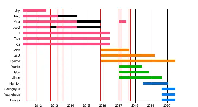 On August 18, 2019, Rania announced via their official Instagram account that they would be performing in Romania from September 4–5 with three new members, although the names and faces of the three were not announced yet. Fans began speculating that this meant Zi.U and Jieun had left the group.[72] On August 28, the group's official YouTube account uploaded a video promoting its Romanian performance as well as revealing the three new members as Seunghyun, Larissa, and ex-Stellar member Youngheun, as well as confirming the departures of Jieun, Zi.U and Ttabo.[73]
