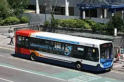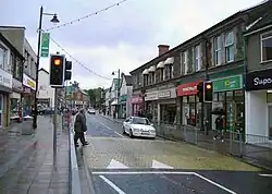 Blackwood has no heavy or light rail links; local bus services run between Blackwood Bus Station and Ystrad Mynach with a link to Transport for Wales' Rhymney Line. Blackwood appears in the preliminary South Wales Metro plan published by Transport for Wales as being a possible extension to the rail links. The Sirhowy Tramroad, which was constructed in 1797, ran through what is now High Street. The tramroad was converted to a standard-gauge Railway in 1860 and was taken over by the London and North Western Railway (LNWR) in 1876 which was incorporated into the London, Midland and Scottish Railway (LMS) in 1923. Passenger services ran from June 1865 until June 1960. Mineral traffic to coal yards at Blackwood & Tredegar continued until April 1969 with track lifted the following year.[10] Some evidence of the railway still exists such as the underpass at Cwmgelli, most of the line is now a cycle path. The site of Blackwood railway station is now occupied by KFC.