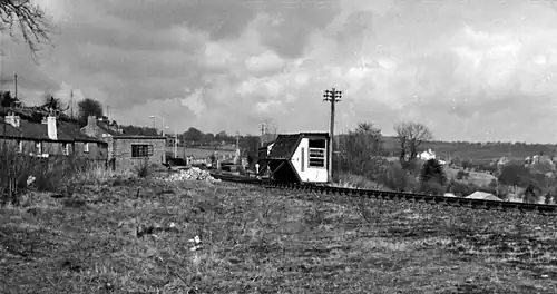 ![]() The remains of Blackwood station in April 1965, looking south towards Nine Mile Point. The remnants of the signal box can be seen on its side. | |||||