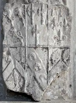 Sir William Kirkham (died 1623), nephew, son of Richard Kirkham of Pinhoe in Devon by his wife Agnes Cape of Somerset.[11] He married (as his second wife) Mary Tichbourne (died 1627), a daughter of Peter Tichbourne of Hampshire[11] and a sister of Chidiock Tichbourne (1562-1586), a conspirator and poet. By Mary he had 8 sons and 4 daughters, the second son being Francis Kirkham who married the heiress of Roope of Bidwell, Newton St Cyres, and founded the line of Kirkham of Bidwell. His kneeling effigy, dressed in armour with neck-ruff and bareheaded, survives in the Kirkham Chantry, facing that of his wife.[26] Between the figures is a column on which is sculpted at top a sunburst inscribed with the letters "IHS" below which is inscribed "SPES ET" ("hope and"), below which is a crown, the browband of which is inscribed "CORONA" ("crown"), below which is a pair of hearts overlapping. At the base of the central column is a heraldic shield sculpted with six quarters, apparently not in its original position. The two outermost columns are each decorated with four heraldic shields, seven of which have been chiselled flat and unintelligible. The only arms still visible are on the top left shield, showing Kirkham impaling a field vair, but with the chief chiselled flat. On top of all three columns is a putto, with wings folded over his chest, but with face features chiselled away. The monument was "covered with plaster" until 1753, when on its removal the following inscription was revealed (since disappeared):[26]