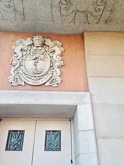 The new church and school on Sunset Boulevard were designed by Thomas Franklin Power. Power designed the Blessed Sacrament School, which opened in 1923, in an Italian Renaissance style. When the new school opened, its enrollment was 370 students. Power next turned his attention to the new church, which he adapted from the Basilican style of the Italian Renaissance style.[6] The roof, however, was made of tile instead of the flat roof typical of Roman churches. Power designed the interior with flanking arches to be reminiscent of the San Paolo and St. Clement Basilicas in Rome.[6] The new church was dedicated in June 1928. With its 223-foot chimes tower, ornate exterior and seating for 1,400 people, Blessed Sacrament quickly became a Hollywood landmark.[7]