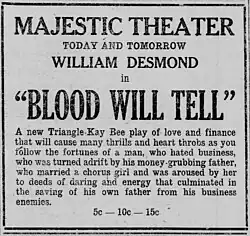 Blood Will Tell is a 1917 American silent drama film directed by Charles Miller and starring William Desmond, Enid Markey and David Hartford.[1] The film's sets were designed by the art director Robert Brunton.