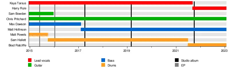 Guitarist Chris Pritchard is inspired by nu metal acts such as Korn and Slipknot, namely their first and second albums, stating that he fell in love with songs such as “Wait and Bleed”;[46][1][47] vocalist Kaya Tarsus is more-so inspired by hardcore bands such as the Dillinger Escape Plan, Converge, and Every Time I Die.[1][37][47] In full contrast, former drummer Sam Hallett's favorite band is The 1975; he is also a huge fan of R&B[1] together with Funeral For a Friend.[47] Other influences they have cited include Touché Amoré, Korn, Limp Bizkit, Machine Head,[48] Davey Muise-era Vanna[49] and La Dispute.[50]