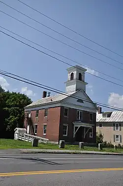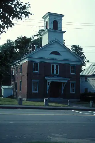 The Bloomfield Academy is a two-story brick structure with a gable roof, granite trim, and a granite foundation. It is topped by a two-stage tower, whose first stage is a plain clapboarded square with a simple cornice, and whose second stage has arched louvered openings flanked by pilasters, with an entablature and cornice above. The main (east-facing) facade is three bays wide, with brick piers dividing them. There is a double-door entry in the center, sheltered by an extended hip-roofed hood. The flanking bays have sash windows at both levels, while the second level above the entry as a double sash window. The gable end above is clad in clapboards, and has a semi-oval window in its center.[2]