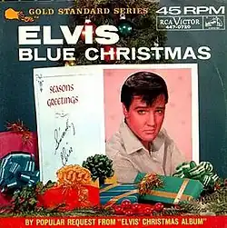 Elvis Presley cemented the status of "Blue Christmas" as a rock-and-roll holiday classic[7] by recording it for his 1957 LP Elvis' Christmas Album. Presley's version is notable musicologically as well as culturally in that the backing vocal group, the Jordanaires (especially in the soprano line, sung by Millie Kirkham), replace many major and just minor thirds with neutral and septimal minor thirds, respectively. In addition to contributing to the overall tone of the song, the resulting "blue notes" constitute a musical play on words that provides an "inside joke" or "quail egg" to trained ears. "Blue Christmas" was also included on a 1957 45 EP (Extended Play) entitled Elvis Sings Christmas Songs (EPA-4108), which also included "Santa Bring My Baby Back (To Me)" on side one, with "Santa Claus Is Back in Town" and "I'll Be Home for Christmas" on side two. Presley's original 1957 version was released as a commercially available single for the first time in 1964. This single was also a hit in the United Kingdom, reaching No. 11 on the British singles chart during the week of December 26, 1964.[8]