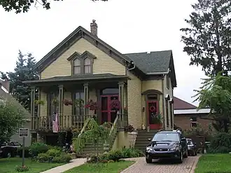 The house was built by Carlton Wadhams (1810–1891), who came to Blue Island in 1839 from Goshen, Connecticut, and farmed on land north of the village until he opened the American House Hotel (building extant) in 1844. During his time in Blue Island, Wadhams made his first fortune as the owner of the hotel and as a cattle dealer, staying until c. 1857 when he sold his holdings and moved to South Bend, Indiana. In South Bend he was one of the founders of the Dodge Manufacturing Company and of the First National Bank, where he was a director until his death.[59] Wadhams sold the house along with all of the property on which it was located, which included the American House and all of the land between what is today Western Avenue, Maple Avenue, Burr Oak Avenue and Vermont Street to Joshua Palmer Young (1818–1889),[60] who, by himself beginning in 1848 and in a partnership with John K. Rowley that was established in 1866, played an important role in the development of the Chicago communities of Beverly Hills, Morgan Park,[61] Near West Side, Washington Heights and Englewood,[62] as well as the suburban communities of Blue Island, South Lawn (now Harvey),[63] Homewood and South Holland.