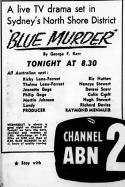 Blue Murder is an Australian live television play which aired in 1959 on ABC. Broadcast live in Sydney on 2 December 1959, a kinescope ("telerecording") was made of the broadcast so it could be shown in Melbourne (it is not known if it was also shown on ABC's then-new stations in Adelaide and Brisbane).[6]