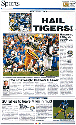 ![]() The sports page of the Baton Rouge Advocate on November 10, 2002, the day after the "Bluegrass Miracle." The top photo shows Kentucky defenders deflecting the pass, and the large center photo shows LSU wide receiver Devery Henderson right after catching the pass for the walk-off touchdown. | |||||||||||||||||||