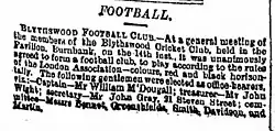 In 1880, some of the club members founded a junior offshoot which became a founder member of the Scottish Junior Football Association,[7] and Blythswood played in the inaugural Scottish Junior Cup that season; although the club beat Luton 1–0 in the first round,[8] a protest saw a replay being ordered,[9] and the club eventually lost in a second replay.[10] The last recorded game Blythswood game was a 9–0 defeat to the Hawthorne club in 1882;[11] a game against Glenburn scheduled for the next month does not seem to have taken place.[12]