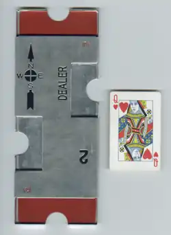 First used in duplicate whist in the 1890s, the devices were called duplicate whist trays. Since the first[1] in November 1891,[2] numerous patents[3] have been registered incorporating a variety of shapes, sizes and materials and having various means of inserting and retaining the cards in place in the trays or apparatus, as they were often referred to in the patent description. Amongst the earliest versions were those manufactured by Ihling Brothers & Everard of Kalamazoo, Michigan[4], [5] and referred to as the Kalamazoo Tray,[6] a square tray, getting award-winning recognition at the 1893 Chicago World's Fair.[7] The company's interests in duplicate whist trays were purchased by The Duplicate Whist Co. in 1899, which introduced a tray known as the Paine's Duplicate Whist Tray after its president, Cassius M. Paine; Paine used the U.S. Playing Card Co. of Cincinnati as his sole manufacturing and sales agent.