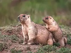 The bobak marmot (Marmota bobak), also known as the steppe marmot, is a species of marmot that inhabits the steppes of Eastern Europe and Central Asia. It is a social animal and inhabits steppe grassland, including cultivated field borders. It hibernates for more than half the year. Litter sizes average about five offspring and it takes three years for the young marmots to reach sexual maturity. Male offspring leave the home colony after their second winter, and about 60% of mature females give birth in any one year.