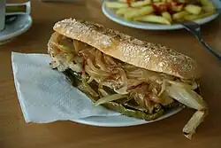 - Portuguese Bocadillo (prepared with pork sausage, fries and green pepper)