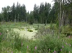 A bog or bogland is a wetland that accumulates peat as a deposit of dead plant materials – often mosses, typically sphagnum moss.[1] It is one of the four main types of wetlands. Other names for bogs include mire, mosses, quagmire, and muskeg; alkaline mires are called fens. A bayhead is another type of bog found in the forest of the Gulf Coast states in the United States.[2][3] They are often covered in heath or heather shrubs rooted in the sphagnum moss and peat. The gradual accumulation of decayed plant material in a bog functions as a carbon sink.[4][5]