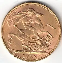 The Bombay Mint sovereign is a British one pound coin (known as a sovereign) dated 1918, minted from August 1918 to April 1919 at the Royal Mint’s Bombay branch. It has an "I" mint mark, to distinguish it from other sovereigns.