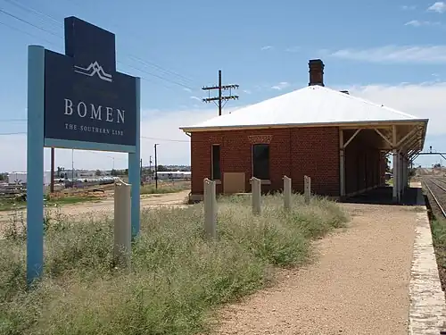 Bomen railway station is a heritage-listed closed railway station located on the Main South line at Bomen in the Riverina region of New South Wales, Australia. The station opened in 1878 as North Wagga Wagga and was briefly the terminus of the line before a bridge was constructed across the Murrumbidgee River to reach Wagga Wagga. It was renamed Bomen in 1882.[1] The property was added to the New South Wales State Heritage Register on 2 April 1999.[2] Passenger trains no longer stop at the station.[1]