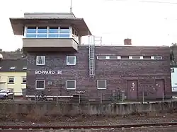 An important step in achieving today's high-capacity line on the left bank of the Rhine was the modernisation of the interlocking technology in the 1970s. Pre-planning and design work for new signal installations in the Boppard area began in 1974. After about two and a half years of construction, the Boppard Bf signalling centre was put into operation on the night of 28 August 1977. It replaced mechanical signalling and safety equipment from the period before the First World War. In 1994, the new entrance building was opened in Boppard. The 1859 station building was originally left standing in accordance with a preservation order,[4] but it had to be demolished in 1989 to permit the relocation of federal highway B 9.[6] The handling of freight in Boppard and on the Hunsrück railway was abandoned, allowing Deutsche Bahn to dismantle the tracks and points at the station from 1998.[7][8] In particular, tracks 5 and 6 and the freight handling facilities were removed. This site is now in the control of the town of Boppard and serves as a parking lot. Remnants of track 5 are still visible.