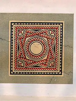 Botfield’s excavations revealed a large range of rooms which ran from north to south, part of which was a bath suite. It was deduced that the buildings were built over a period of time and that the northern rooms are later additions.[5] The earliest parts of the villa were built in the early years of the Roman occupation.[6] The villa consisted of a single storey and was constructed from the local marlstone (sandstone), infilled with rubble. The inside walls were plastered, as may have been the exterior, although this is not certain. The building had a tiled roof, examples of which can be seen in Northampton Museum. Some specimens of frescoed plaster were found still clinging to the remains of interior walls. It was also discovered that the villa had an elaborate heating system installed under the building. Hot air from a furnace or hypocaust flowed through the building by means of flues. Some of the floors were supported upon brick or flat stone piers which supported the floor leaving a two to three foot gap in which the air flowed. Botfield also discovered a well south-west of the villa. The well was stone lined and in the upper levels of the well a skeleton was found, with bronze accoutrements as well as an iron fibula (a brooch) and hook.