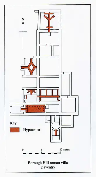 Borough Hill Roman villa is located on the north tip of Borough Hill, a prominent hill near the town of Daventry in Northamptonshire.[1] The villa’s remains lie within the ramparts of an Iron Age fortress which covers the summit of the hill. The remains of the Roman villa were discovered in 1823 by the historian and archaeologist George Baker, who identified Borough Hill with the Benaventa of the Britons and Isannavaria of the Romans.[2] The remains were not fully excavated until 1852 when local historian Beriah Botfield thoroughly excavated and recorded the site.[3] Botfield employed an artist to make drawings of the site and these illustrations along with Botfield's notes, manuscripts and some of the antiquities found on the site are now kept at the British Museum.