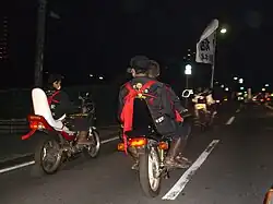 Numbers slowly began to decline following the 1980s peak. It is reported that, by the 1990s there were around 28,000 bōsōzoku sprinkled throughout the country.[7] In 2004, the Japanese government passed a revised road traffic law which gave the police more power to arrest bikers riding recklessly in groups. With increased arrests and prosecutions, bōsōzoku participation rapidly went into decline. As of 2010, police reported that the new trend among bōsōzoku was to ride together in much smaller groups and to ride scooters instead of heavily modified motorcycles. Aichi prefecture was reported to have the highest number of riders, followed by Tokyo, Osaka, Ibaraki and Fukuoka.[8] By 2015, there were only a reported 6,771 active bōsōzoku throughout Japan.[6] In 2013, the National Police Agency re-classified bōsōzoku biker gangs as "pseudo-yakuza" organizations.[9]