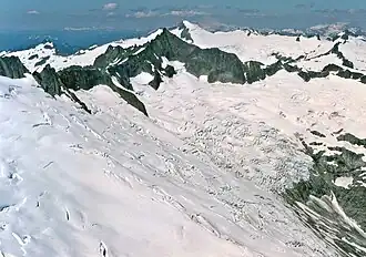 Boston Glacier is located in a large cirque below several mountain peaks in North Cascades National Park in the U.S. state of Washington.[2] Approximately 1 mi (1.6 km) long but nearly 3.5 mi (5.6 km) wide, it is the largest glacier in North Cascades National Park.[3] Extending in an arc from the north of Forbidden Peak, it is flanked by Boston Peak to the southwest and Buckner Mountain at its eastern margin, between which it lies below the arête known as Ripsaw Ridge. Another arête extending between Boston Peak, Sharkfin Tower, Forbidden Peak and further north separate Boston Glacier from the nearly adjoining Quien Sabe and Forbidden Glaciers. Boston Glacier has been in an overall state of retreat since the end of the Little Ice Age around the year 1850. A moderate advance occurred between 1950 and the mid-1970s; however, the retreat resumed and between 1972 and 2006 its terminus retreated 1,470 ft (450 m).[4]
