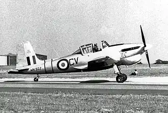 As the Mamba was not flight-ready at the time of the first prototype's completion, it was instead powered by a 820 hp (611 kW) Bristol Mercury 30 radial engine during its initial test flights.[6][1] Thus powered, it first flew on 30 May 1947, after teething issues with the undercarriage had been resolved during ground testing. The second prototype, powered by the intended Mamba engine, first flew on 17 May 1948, becoming the world's first single-engined turboprop aircraft to fly.[1] Early handling trials at MOD Boscombe Down revealed the aircraft to possess relatively gentle and easy flight characteristics across all typical circumstances, with only minor suggestions for improvements being produced, such as the lack of a port-side walkway and directional snaking unbecoming to a gun platform.[7]