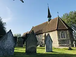 The Church of St. John The Evangelist was completed in 1854. It is a small flint church in the Gothic Revival style with a steep pitched roofs and decorative red tiles topped with a small wooden spire, a timber-framed porch and a semicircular apse at the east end.[10][12] The six stained glass windows in the apse are early works by Alfred Bell. In 1889-1891 the chancel was altered to add a richly carved altar and a Gothic reredos depicting the Resurrection, and the domed apse ceiling was decorated with a painted scene of Dante's vision of Heaven, painted by David Bell.[11] In 2001 four of the Alfred Bell stained glass windows were stolen. These have since been replaced by replica windows, installed in 2003.[13]