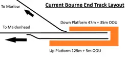 Bourne End is a terminus but effectively acts as a through station, with the driver having to change ends to continue to the next station. During peak hours service frequency is increased by having two trains work the line, each using Bourne End as the terminus: one runs Marlow – Bourne End and one Maidenhead – Bourne End, with passengers changing trains at Bourne End. This service pattern is needed to meet peak-time demand, as the platforms at Bourne End are not long enough to accommodate longer trains. While Bourne End has two platforms, platform 2 is only accessible from Maidenhead and not from Marlow, and so cannot be used as a passing loop. Since May 2017 there are no through trains to London Paddington.