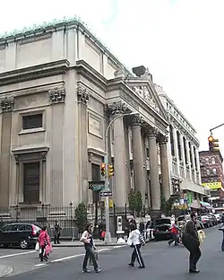 The building's facade is split into two sections: the Bowery elevation and the connected Grand Street and Elizabeth Street elevations.[5] The exterior features Corinthian columns and sculpted pediments by Frederic MacMonnies.[16][7][21] According to Stanford White's descendants, the building's exterior "invoked the authority of ancient Rome" with its design details, including porticos on Bowery and on Grand Street.[22] Wrought iron grilles are also placed in front of numerous windows and doors.[5] The building's basement is clad with a granite water table,[10] while the superstructure is clad with Indiana limestone.[11][12] In addition, the roof is largely covered with Roman tile, except above the banking room, where there is a glass skylight with metal ribs.[10]