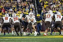 The Falcons began Nehlen's fifth season as head coach against Purdue on September 16, 1972.[32] The game was tied in the fourth quarter when the Falcons moved into field goal range and Don Taylor kicked the ball through the uprights to give the Falcons a 17–14 upset win against a top 20 ranked opponent.[7][33] In the 1973 season, BG again picked up a big opening win, at Syracuse 41–14.[32][33] The Falcons' rushing game greatly improved under Nehlen. The team was led by Paul Miles, who ran for more than 1,000 yards in three consecutive seasons from 1971 to 1973.[7] Miles teammate, Dave Preston earned a position as the career leader in rushing with 3,423 yards during his time with the Falcons. In 1975, Dan Saleet rushed for a team leading 1,114 yards.[7] Nehlen led the Falcons added two more upsets in the Nehlen era with a 23–21 win over BYU and a 22–7 win against Syracuse in 1975 and 1976 respectively. The major wins gave Nehlen the unofficial title of the “Master of the Upset” from many BGSU fans.[33] Nehlen left Bowling Green after the 1976 season and guided the Falcons to a 53–35–4 record in nine seasons as head coach.[33] He went on to coach at West Virginia and coached 21 seasons for the Mountaineers and became the 17th coach in NCAA Division I-A history to record 200 victories with a 202–128–8 overall record.[34]