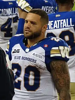 Brady Oliveira (born August 15, 1997) is a Canadian professional football running back for the Winnipeg Blue Bombers of the Canadian Football League (CFL). After finishing his college career among the University of North Dakota's all-time leading rushers, he was drafted with the 14th overall pick in the 2019 CFL Draft, making him the first overall running back selected.[1] He is a two-time Grey Cup champion after winning with the Blue Bombers in 2019 and 2021. He was also named to the All-CFL team in 2023 and 2024 and also won the CFL's Most Outstanding Canadian Award in both of those years while being named the CFL's Most Outstanding Player in 2024.