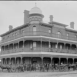 The venue was constructed in 1896 and initially named the Great Western Hotel. Its first publican was Myer Rosenweig.[6] By 1899 the licensee was with Mr. George West, an altercation that year made local headlines after he was charged with obstructing police from arresting patrons.[7][8] In 1906 it was in the hands of Mr. Chas Brewer,[5][9] and in 1907 in the hands of Mr. Bert Porter.[10]