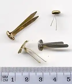 A brass fastener, butterfly clips, brad, paper fastener or split pin is a stationery item used for securing multiple sheets of paper together. A patent of the fastener was issued in 1866 to George W. McGill.[1] The fastener is inserted into punched holes in the stack of paper, and the leaves, or tines, of the legs are separated and bent over to secure the paper. This holds the pin in place and the sheets of paper together. For few sheets of paper, holes can be made using the sharp end of the fastener.
