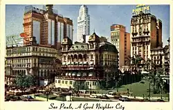 The new aesthetic also stimulated the remodeling of Rio's traditional leisure centers such as Casa Cavé and Confeitaria Colombo, still considered one of the ten most beautiful coffee houses in the world, as well as the flourishing of rhythms such as choro and samba.[27] Sophisticated hotels such as the Copacabana Palace Hotel, the Glória Hotel and the Balneário Hotel (which later became better known for housing the famous Urca Casino) were inaugurated for the Independence Centenary International Exposition.[28][29] On September 7, 1929, the Joseph Gire Building, the first skyscraper in Brazil, was inaugurated. As a result of all these transformations, in 1928 the journalist and writer from Maranhão, Coelho Neto, described the city in short stories as "A Cidade Maravilhosa" (English: The Marvelous City), a nickname that inspired the carnival march of the same name, composed in 1934 by Antônio André de Sá Filho.[30] In São Paulo, during the First Brazilian Republic (1889-1930), the city industrialized and the population increased from around 70,000 in 1890 to 240,000 in 1900 and 580,000 in 1920. The peak of the coffee period is represented by the construction of the second Luz Station (the current building) at the end of the 19th century and by the Paulista Avenue in 1900, where many mansions were built.[31][32]