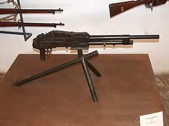 It was also adapted for use as an infantry machine gun.[2] For this purpose the gun was mounted on a machine-gun tripod by means of an adapter, and was fitted with a temporary rear sight on the right of the body and a temporary front sight on the right of the barrel at the muzzle. The temporary open sights took the place of the optical sight used when the gun was tank-mounted.