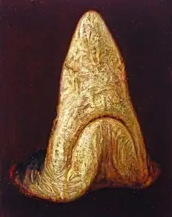 Zlamany first attracted notice for meticulously rendered paintings of animal carcasses (birds, blowfish, snakes, sharks, iguanas), isolated and floating ambiguously in dark, painterly abstract fields (e.g., Shark Head #2, 1992).[31][8][32] She began this work in the mid-1980s as a way to connect to visceral experience and elements of art practice—painting, craft, beauty—that she felt women were discouraged from pursuing.[28] Reviewers noted her mastery of academic glazing techniques, delicate sense of color and texture, and paint application suggestive of both Old Master and Abstract Expressionist technique;[27][4][9][41] in psychological terms, they described the paintings as "disquietingly seductive,"[42] vaguely allegorical, icon-like contemplations of life, death, desire and spirituality.[43][44][45][46] Janine Cirincione wrote that they "teeter on the edge of abstraction and representation, old master bravura and postmodern theory, between the seductive and the gruesome," with freewheeling art historical borrowings that challenged both traditional pictorial values and contemporary negations of representational work.[8] Barry Schwabsky likewise noted the work's conceptual preference for investigating materiality and illusionism and art's "half-feared, half-desired" fascination with representation and beauty over realism.[4][28] In a later series, Zlamany painted posed, live snakes that emphasized linear decoration, pattern and male sexuality while subverting traditional cultural associations of snakes with the feminine.[13][44][11]