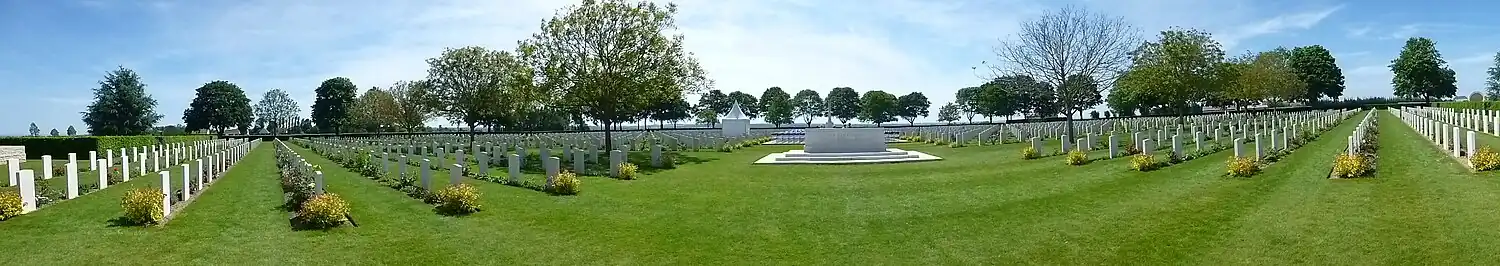 Bretteville-sur-Laize was created as a permanent resting place for Canadian soldiers who had been temporarily buried in smaller plots close to where they fell. At the time of the cemetery's creation, France granted Canada a perpetual concession to the land occupied by the cemetery.[1] Of the 2,958 burials, 2,782 are Canadian of whom 87 remain unidentified, together with 80 British, four Australian and one each from France and New Zealand.[2] There are records for 2,792 of the Canadian men.[3]